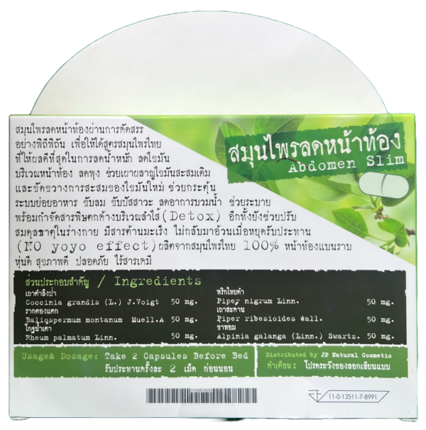Achieve a flatter stomach and a healthier body with Abdomen Slim, the most effective Thai herbal formula for reducing belly fat. Developed from the renowned Rangsit University weight loss herbs, this 100% natural herbal supplement helps burn stubborn fat, prevents new fat accumulation, and supports a healthy digestive system.
