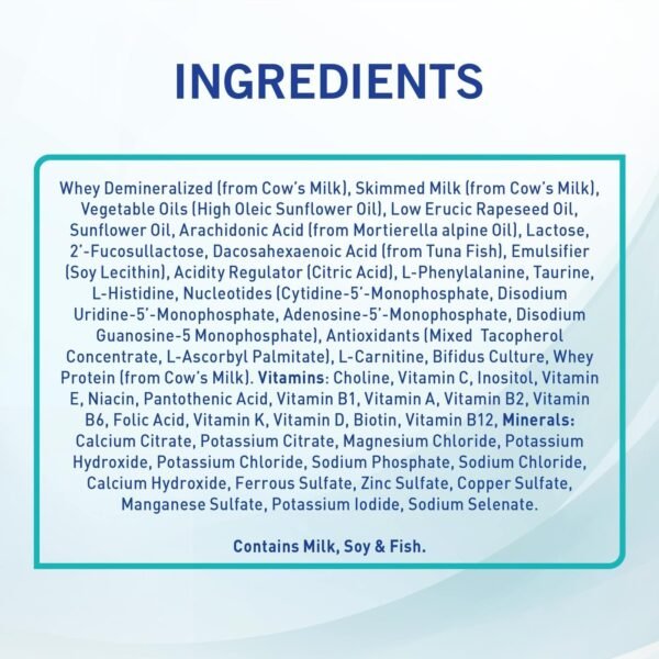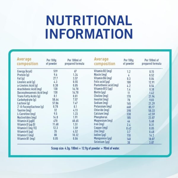 - 2’FL & BL Probiotic: Ingredients that aid in immune and digestive health.